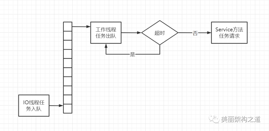 /*** 执行异步任务* 超时时间* 超过此时间,则打印任务在队列中的时间* @param group 任务队列类型* @param handler 任务handler*/public void run(Group group, IAsyncHandler handler) {AsyncTask task = new AsyncTask(taskTimeout, handler);balance(group, task);}/*** 构造异步任务* @param timeout 超时时间(单位:豪秒)* @param handler 执行句柄*/public AsyncTask(int timeout, IAsyncHandler handler) {super();if (timeout < 0) {timeout = 1000;}this.timeout = timeout;this.handler = handler;this.addTime = System.currentTimeMillis();}/*** 任务执行**/public void run() {while (!isStop) {AsyncTask task = null;try {task = taskQueue.poll(1500, TimeUnit.MILLISECONDS);if (null != task) {//重点执行语句:执行超时丢弃的任务队列execTimeoutTask(task);}} catch (InterruptedException ie) {logger.error("has error !", ie);} catch (Throwable ex) {if (task != null) {task.getHandler().exceptionCaught(ex);}}}}/*** @任务超时处理* @param task* @throws Throwable*/private void execTimeoutTask(AsyncTask task) throws Throwable {if ((System.currentTimeMillis() - task.getAddTime()) > task.getQtimeout()) {task.getHandler().exceptionCaught(new TimeoutException(threadFactoryName + "async task timeout!"));return;} else {Object obj = task.getHandler().run();task.getHandler().messageReceived(obj);}}