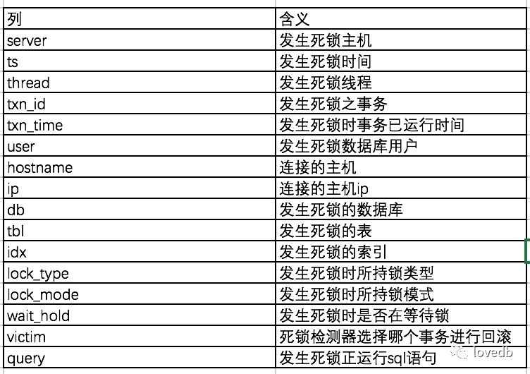 server ts thread txn_id txn_time user hostname ip db tbl idx lock_type lock_mode wait_hold victim querylocalhost 2019-11-22T18:43:48 34 0 23 root localhost zxydb t_lock PRIMARY RECORD X w 0 update t_lock set a=22 where a=2localhost 2019-11-22T18:43:48 35 0 16 root localhost zxydb t_lock PRIMARY RECORD X w 1 update t_lock set a=10 where a=1