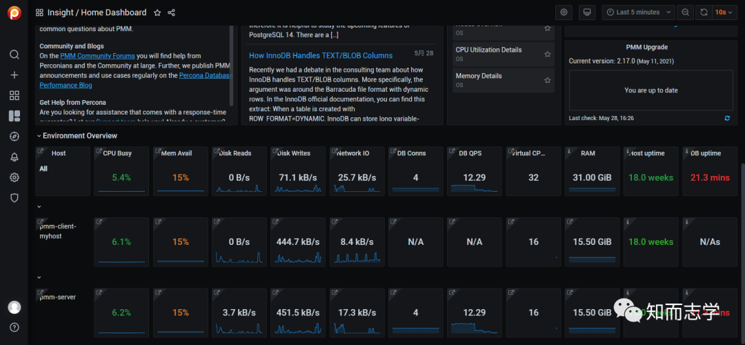 Percona Monitoring and Management (PMM)是一款开源的专用于管理和监控MySQL、MongoDB、PostgreSQL、ProxySQL、AWS RDS性能的开源平台,并且可以监控前述这些数据库所在的服务器资源,通过PMM客户端收集到的DB监控数据用第三方软件Grafana画图展示出来。 通过PMM,可以获得以下信息