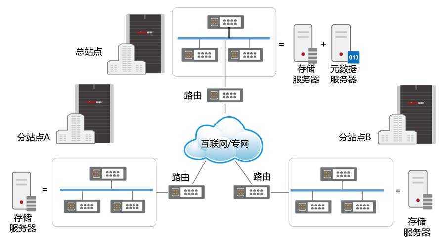 站点之间采用分布式部署方式。每个分支机构内的用户产生的数据就近存放在用户所在的站点,各个站点的业务数据信息(也就是用户信息、部门信息、文档信息、Metadata等信息)实时同步至总站点。