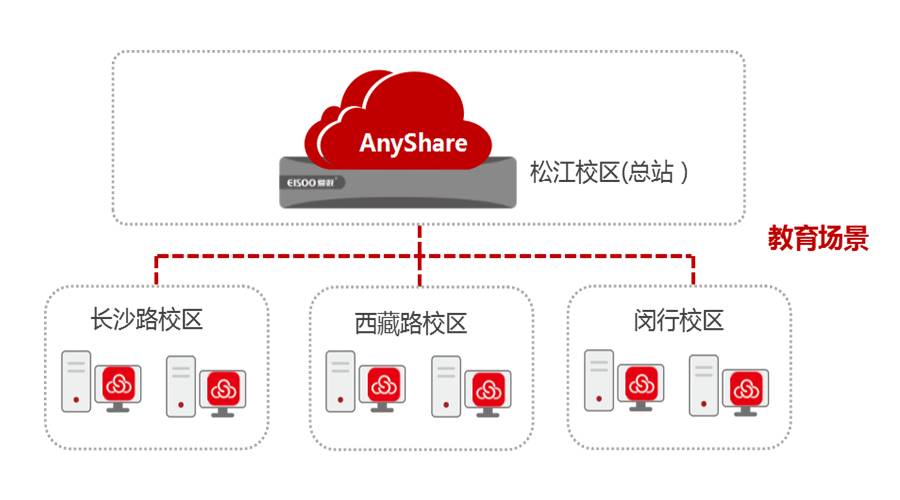 在这里介绍两种典型应用场景,第一种场景适用于教育行业有多个校区的情况,可以在不同校区单独部署AnyShare服务,实现就近访问资料。