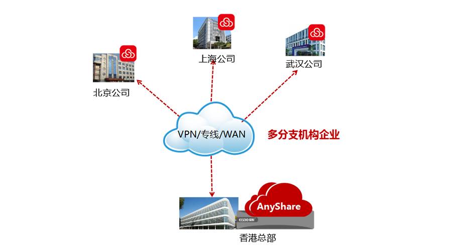 总部与分支结构分别部署AnyShare节点,这些节点之间组成一个大的虚拟AnyShare集群;
