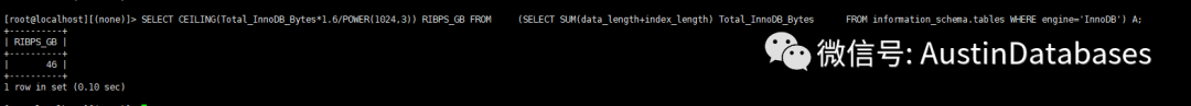SELECT CEILING(Total_InnoDB_Bytes*1.6/POWER(1024,3)) RIBPS_GB FROM (SELECT SUM(data_length+index_length) Total_InnoDB_Bytes FROM information_schema.tables WHERE engine='InnoDB') A;