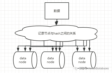 Tbase 的另一个点,就是节点与hash key的对应关系(这点与部分MYSQL的分布式或中间件是不同的),下面是传统的方式进行数据的分片与数据存储节点之间的关系,这个关系是固化的,如果你想剔除某些节点,或添加节点要数据进行rebalance 那你需要在导出导入一遍数据到新的已添加的节点的整体集群,这是很麻烦的一件事。