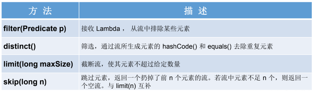 多个中间操作可以连接起来形成一个流水线,除非流水线上触发终止操作,否则中间操作不会执行任何的处理!而在终止操作时一次性全部处理,称为“惰性求值