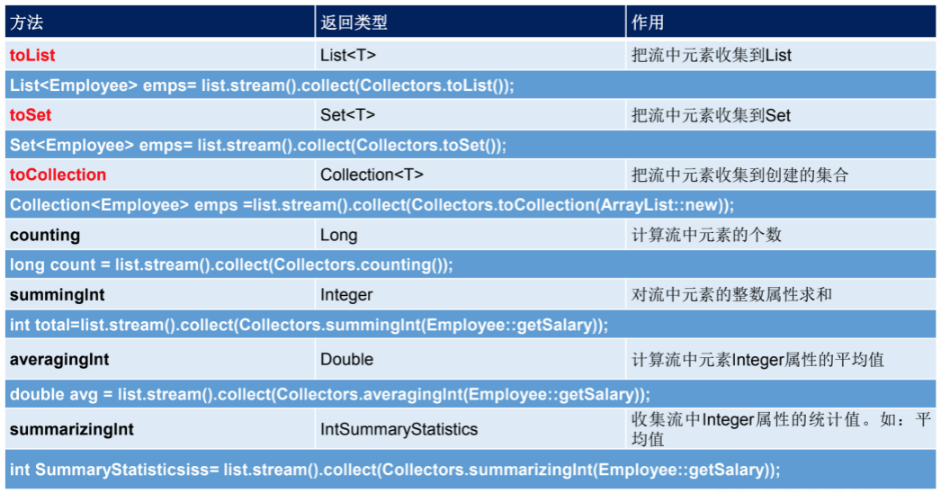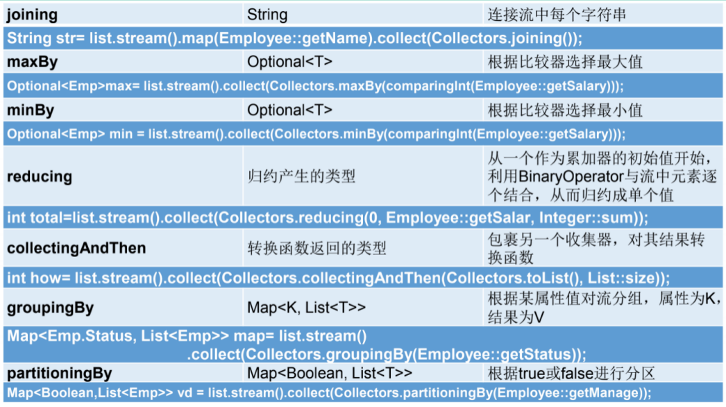 Collector接口中方法的实现决定了如何对流执行收集的操作(如收集到List、Set、Map)。另外, Collectors实用类提供了很多静态方法,可以方便地创建常见收集器实例,具体方法与实例如下表: