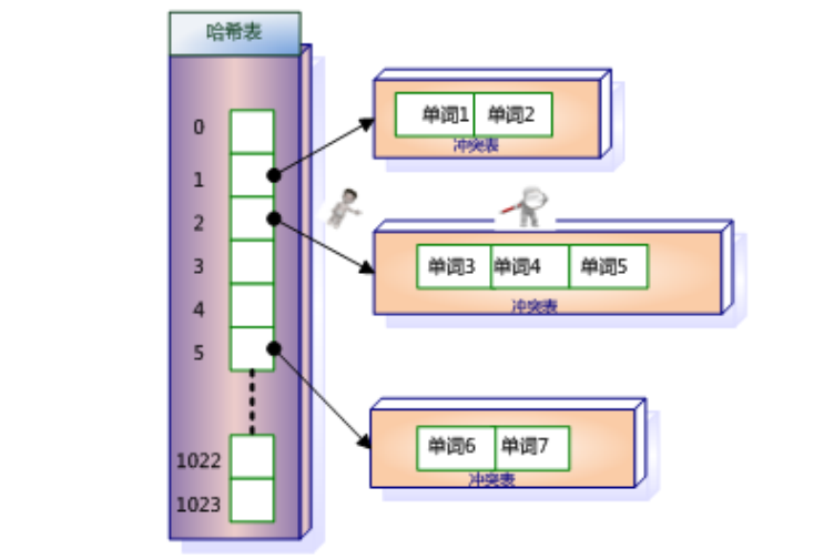 如下图所示,这种词典结构主要由两个部分构成,主体部分是哈希表,每个哈希表项保存一个指针,指针指向冲突链表,在冲突链表里,相同哈希值的单词形成链表结构。之所以会有冲突链表,是因为两个不同单词获得相同的哈希值,如果是这样,在哈希方法里被称做是一次冲突,可以将相同哈希值的单词存储在链表里,以供后续查找。