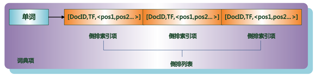 ,这样与一个文档相关的信息被称做倒排索引项(Posting),包含这个单词的一系列倒排索引项形成了列表结构,这就是某个单词对应的倒排列表。如下图所示,在文档集合中出现过的所有单词及其对应的倒排列表组成了倒排索引。