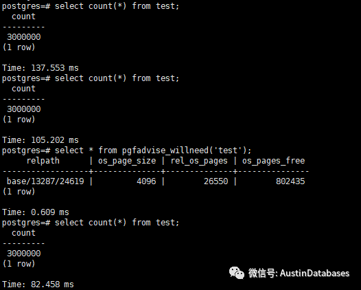 图中我们使用pgfincore插件中的一个,将表或索引预装入到OS 缓存层面的功能,我们再次查询,发现比第二次的速度还快,仅仅300万的数据使用82毫秒。这说明我们将表或索引提升至OS的缓存中,对查询的加速是有效的吗,即使我们用不上什么索引,或没有所以的情况下。