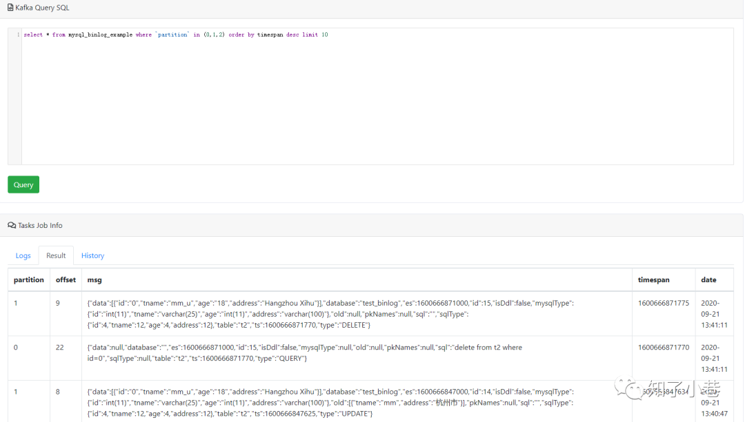2020-09-21 13:40:47.630 [Thread-1] INFO c.a.otter.canal.example.kafka.CanalKafkaClientExample - 14-----FlatMessage [id=14, database=, table=t2, isDdl=false, type=QUERY, es=1600666847000, ts=1600666847625, sql=update t2 set tname='mm_u', address='Hangzhou Xihu' where id=0, sqlType=null, mysqlType=null, data=null, old=null]