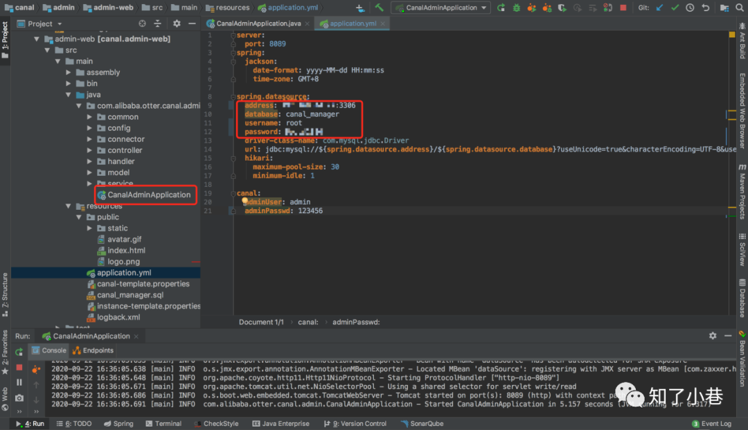 修改配置文件canal/admin/admin-web/src/main/resources/application.yml,变更MySQL数据库连接和用户名密码。