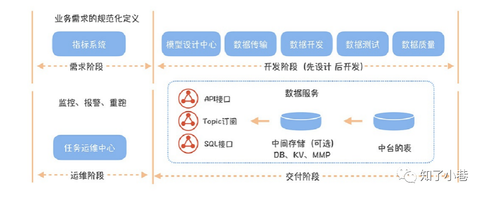 数据中台,提出了数据服务化的思想,数据中台暴露的不再直接是数据,⽽是服务。数据开发不仅需要加⼯数据,还需要把数据发布成API接⼝或者其他服务形式,提供给业务系统或者数据产品调⽤,从⽽形成了单独的数据交付阶段。