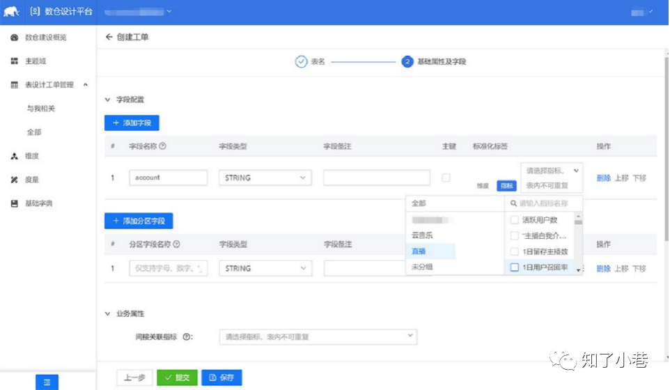 除此之外,在模型设计过程中,要对模型中每个字段关联前⾯设计好的指标,以及可分析的维度。⽐如,我们对下图的account字段,标记为指标“⽤⼾消费⾦额”;user标记为“买家维度”。这个标记会把模型和指标建⽴关联关系,然后把前⾯设计的指标落实到了表中。