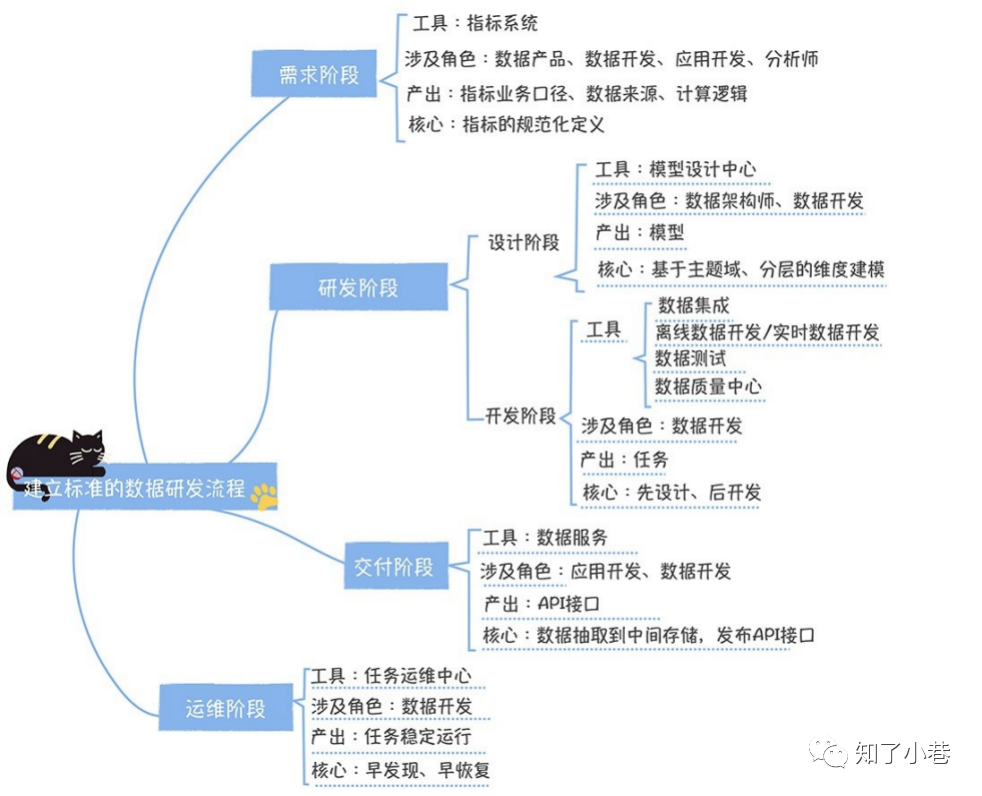 在上述四个阶段中,经常容易忽略的是需求阶段和交付阶段,如果需求定义不⼀致,就很容易导致后⾯的研发返⼯,如果没有标准的数据交付流程,就会数据接⼊慢,同时交付后维护的复杂度会增加。