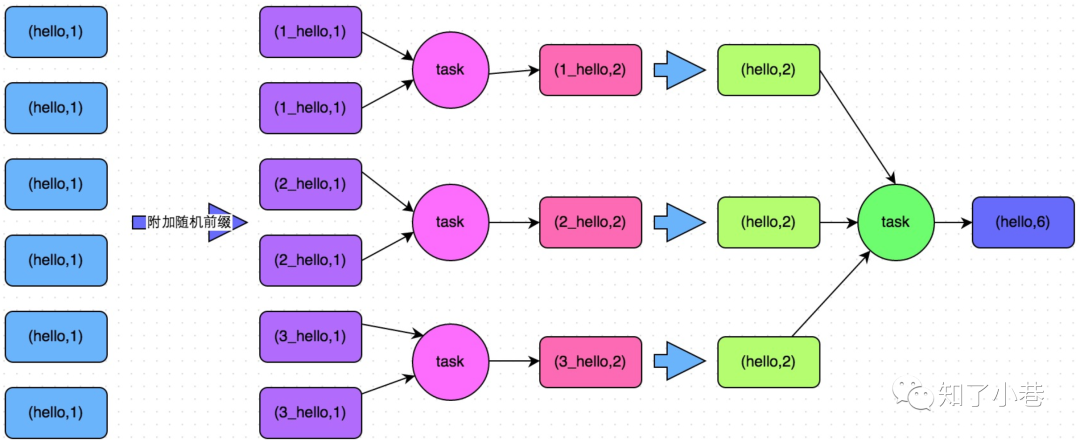 将原先一样的key通过附加随机前缀变成不一样的key,然后就可以将这些处理后的“不同key”分散到多个task中去处理,而不是让一个task处理大量的相同key。