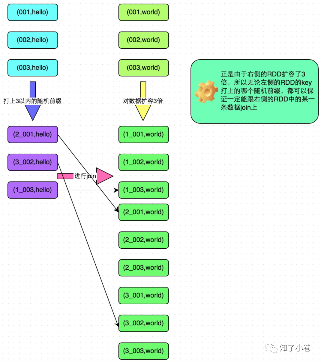 对于join导致的数据倾斜,如果只是某几个key导致了倾斜,可以将少数几个key分拆成独立RDD,并附加随机前缀打散成n份去进行join,此时这几个key对应的数据就不会集中在少数几个task上,而是分散到多个task进行join了。具体原理见下图。