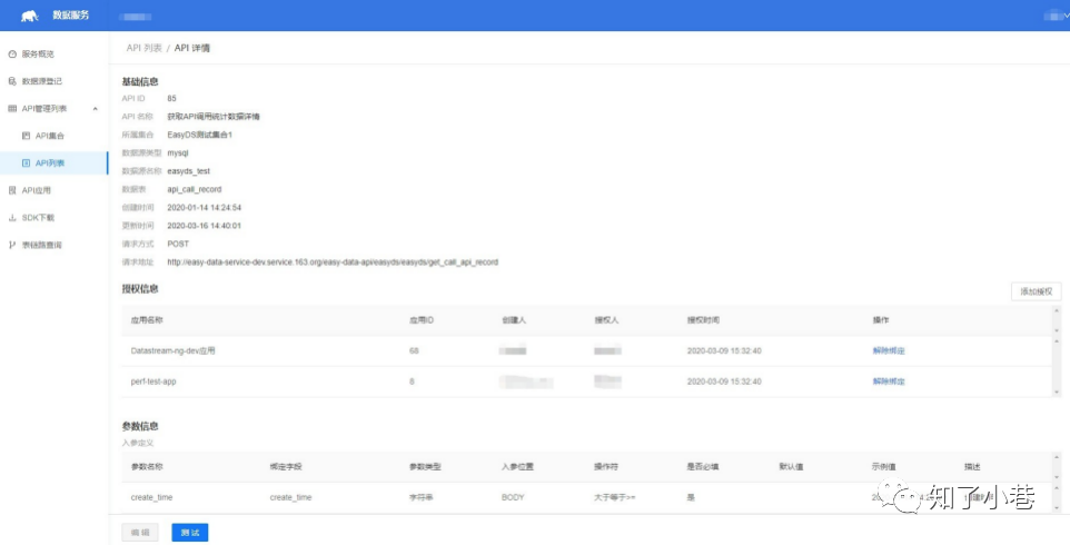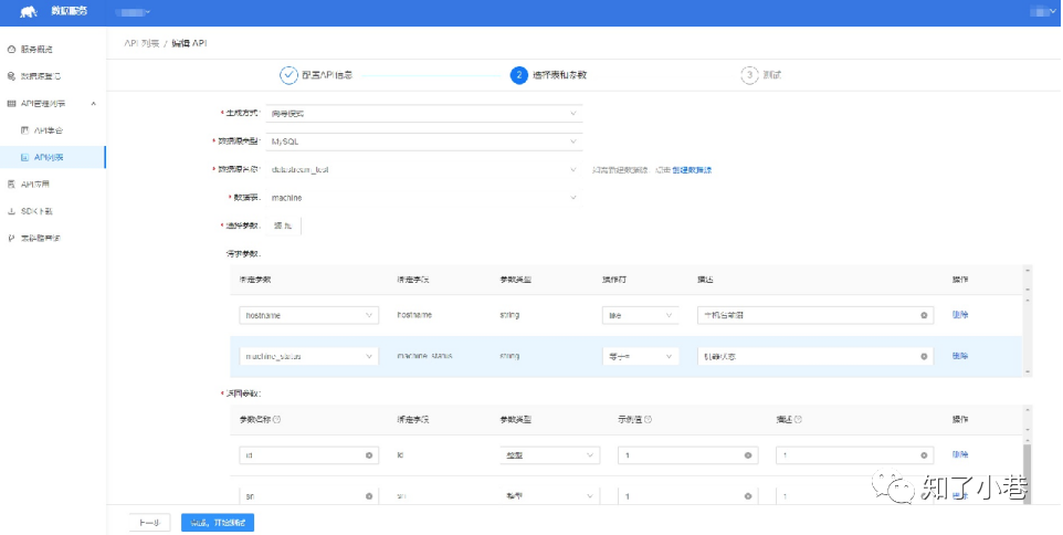在上图中,我们可以在数据服务上,定义每个API接⼝的输⼊和输出参数。