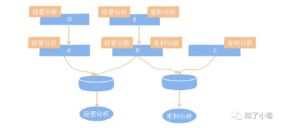 同时,数据服务会把经营分析和表A和B的访问关系,推送给数据中台的元数据中⼼。接着元数据中⼼表A、B以及A和B的上游所有的表(图中D和E)上,就会有经营分析数据应⽤的标签。