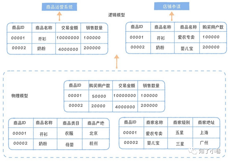 在上⾯这个例⼦中,有三个物理模型,但是主键都是商品ID,针对商品运营系统和店铺参谋,我们可以构建两个不同的逻辑模型,分别从不同的视⻆看数据,逻辑模型并不实际存在,⽽是在查询的时候,根据逻辑模型映射的物理模型字段,动态的地将请求拆分给多个物理模型,然后对多个查询结果进⾏聚合,得到逻辑模型查询的结果。