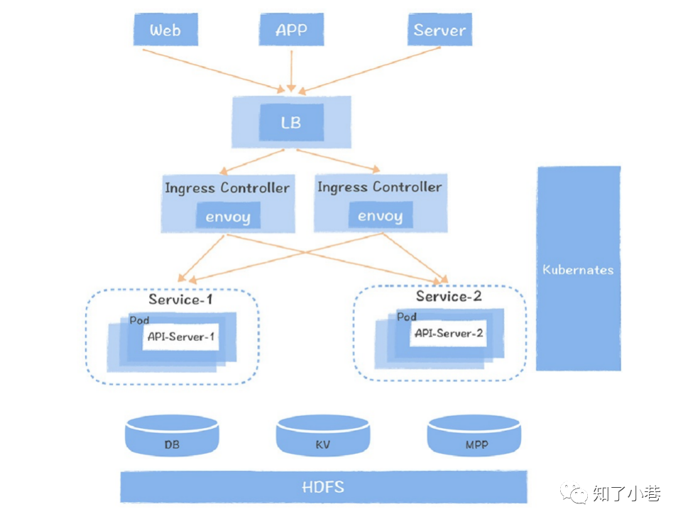 Envoy是服务⽹关,可以将Http请求负载均衡到Service的多个Pod上。Ingress Controller可以查看Kubernates中每个Service的Pod变化,动态地将Pod IP写回到Envoy,从⽽实现动态的服务发现。前端的APP,Web或者是业务系统的Server端,通过⼀个4层的负载均衡LB接⼊到Envoy。