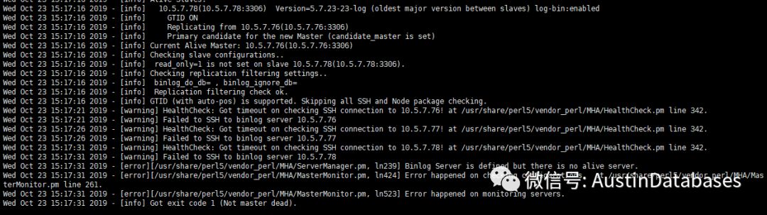 [warning] HealthCheck: Got timeout on checking SSH connection to 10.5.7.76! at usr/share/perl5/vendor_perl/MHA/HealthCheck.pm line 342.