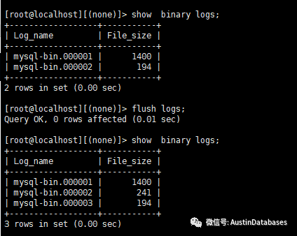 可以看到其中一台机器的BINOG 直到了mysql-bin.000001 而其他的已经 到了 000003 , 怎么办, 只需要将所有的MYSQL 的 binlog 的编号统一就可以解决问题了