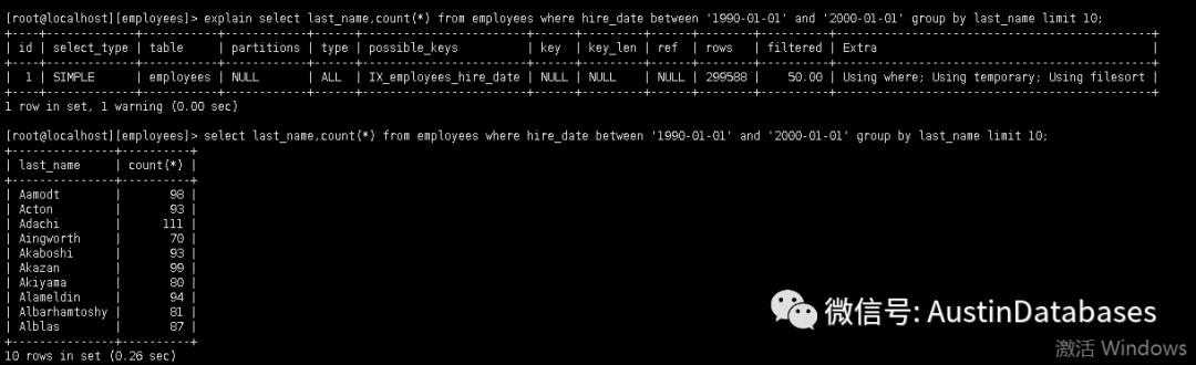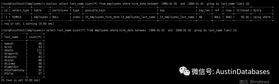 select last_name,count(*) from employees where hire_date between '1990-01-01' and '2000-01-01' group by last_name limit 10;