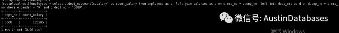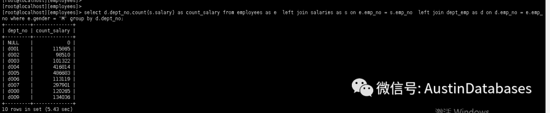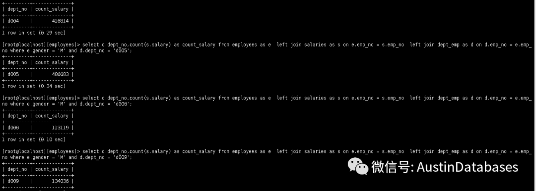 通过下面的语句将每个部门的工资总和获取后,在进行累加的计算(这使用程序来做不是一件困难的事情),最后获得总体的和上面语句一样的结果,而经过实际的操作,整体的查询九个部门的工资最长的不过0.34秒,最短的仅仅0.02秒。整体的查询9次累加的耗时都不超过1 秒。