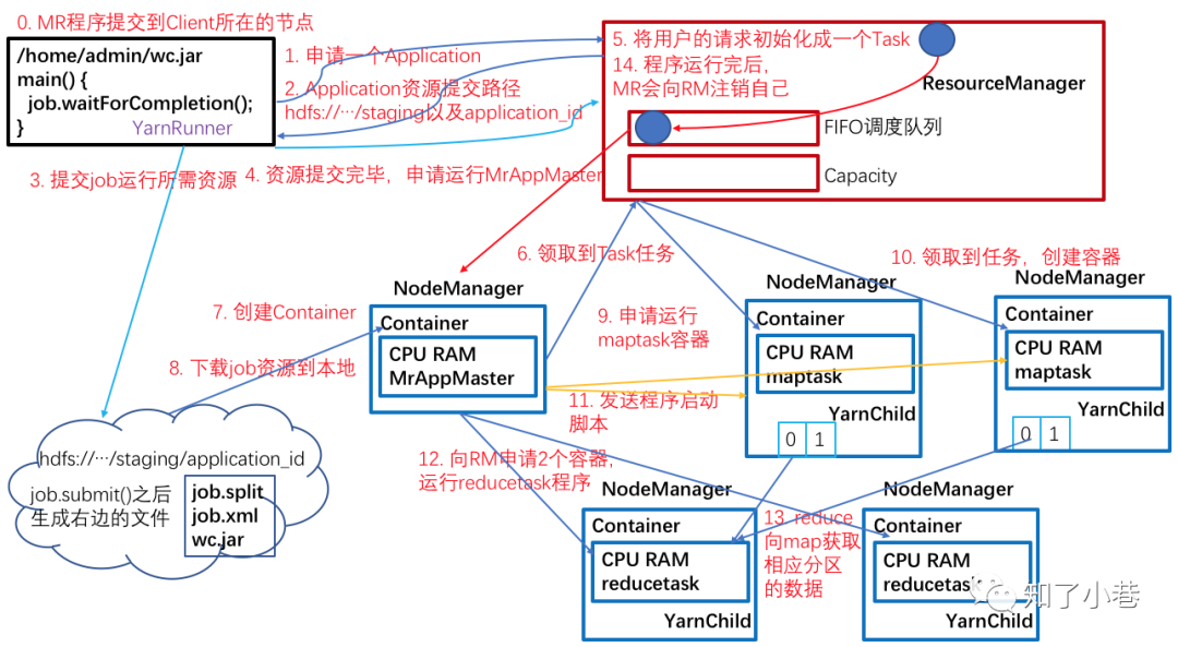 第0步:MR Client端调用job.waitForCompletion方法,向整个集群提交MapReduce作业。