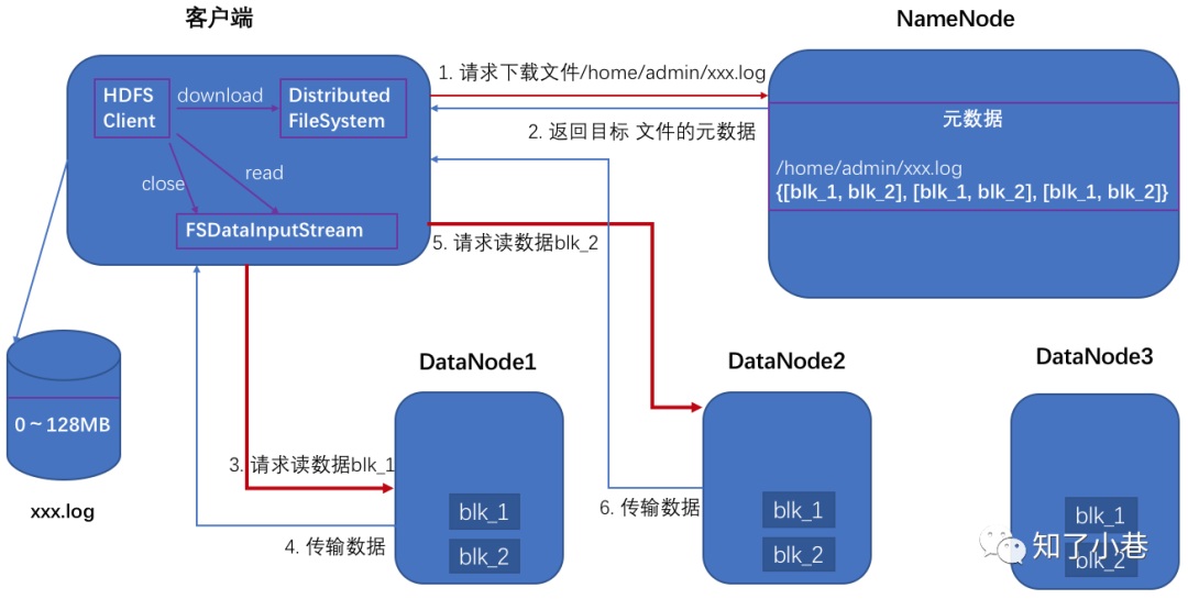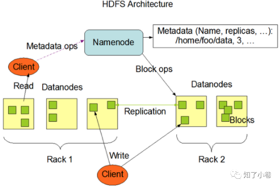 HDFS架构主要由四个部分组成,分别为HDFS Client、NameNode、DataNode和Secondary NameNode。