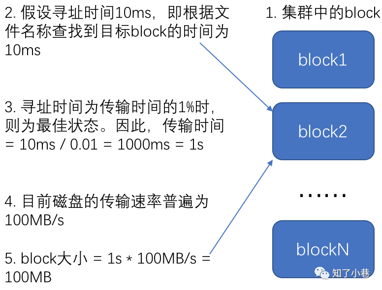 HDFS中的文件在物理上是分块存储(block),块的大小可以通过配置参数( dfs.blocksize)来规定,默认大小在hadoop2.x版本中是128M,老版本中是64M。HDFS的块比磁盘的块大,其目的是为了最小化寻址开销。如果块设置得足够大,从磁盘传输数据的时间会明显大于定位这个块开始位置所需的时间。因而,传输一个由多个块组成的文件的时间取决于磁盘传输速率。如果寻址时间约为10ms,而传输速率为100MB/s,为了使寻址时间仅占传输时间的1%,我们要将块大小设置约为100MB。