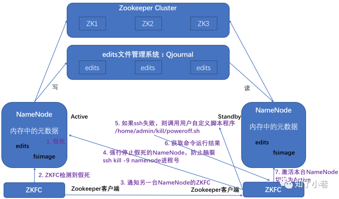 集群中的每个NameNode在ZooKeeper中维护了一个持久会话,如果机器崩溃,ZooKeeper中的会话将终止,ZooKeeper通知另一个NameNode需要触发故障转移。