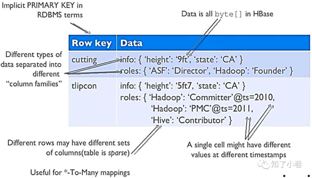 2. 无模式:每行都有一个可排序的主键和任意多的列,列可以根据需要动态的增加,同一张表中不同的行可以有截然不同的列