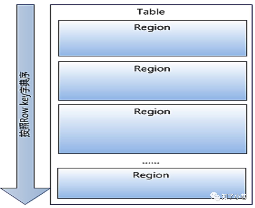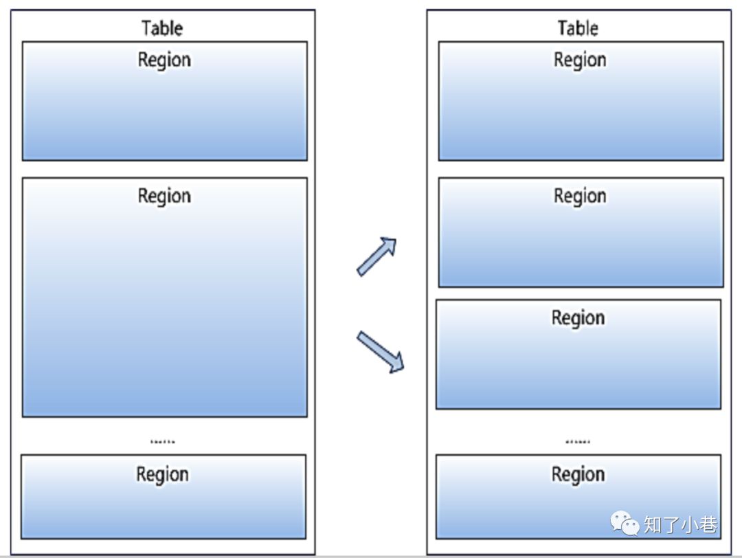 3. Region按大小分割的,每个表开始只有一个region,随着数据增多,region不断增大,当增大到一个阀值的时候,region就会等分会两个新的region,之后会有越来越多的region