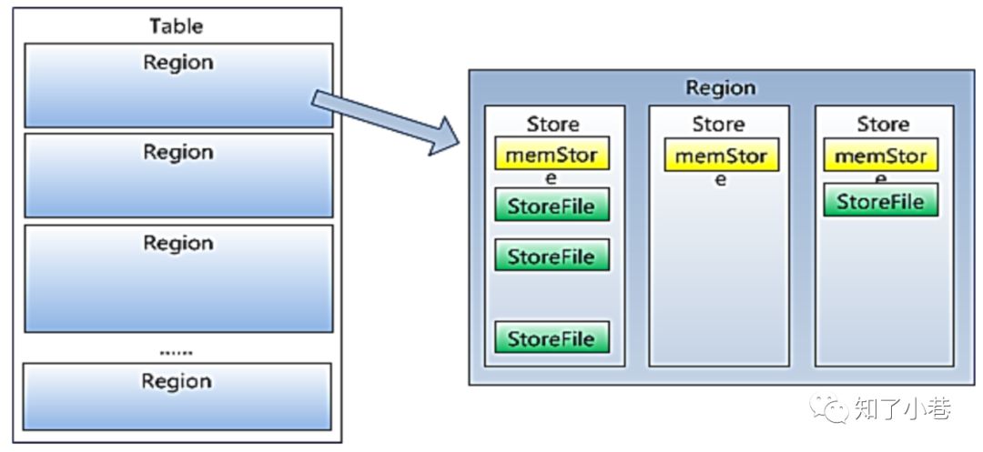 Region由一个或者多个Store组成,每个store保存一个columns family