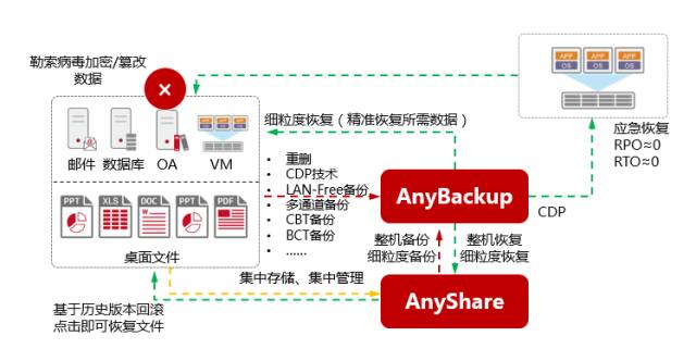 面向企业级用户的桌面终端数据,我们可以采用爱数AnyShare提供集中存储和管理,即使遭到勒索病毒加密或篡改,也可以通过历史版本或者云端回收站恢复数据。此外,我们还可以采用爱数AnyBackup对AnyShare进行备份,为进一步保障桌面文件数据安全。