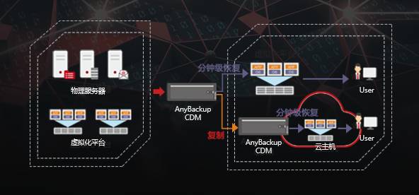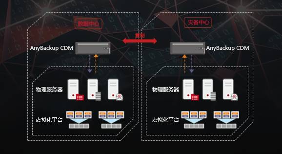 在该方案中,AnyBackup CDM 7.0可通过并行重删、永久增量备份等技术,提升备份效率,节约存储资源。若数据丢失,可通过副本虚拟化和即时挂载技术,实现分钟级数据恢复,满足更高的SLA要求。在此基础上,AnyBackup CDM 7.0支持数据复制功能,可将本地副本数据传输到异地,业务数据可根据需求选择在本地或异地实现快速恢复。