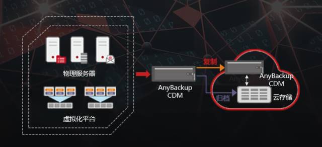 对于频繁使用的数据,可存储于本地的AnyBackup CDM 7.0中,以满足恢复、开发/测试等使用需求。对于使用频率较低的数据,可根据用户需求,通过数据复制功能,传输到云端相应的云版本中,这些副本数据同样支持即时访问、即时查询;或由于合规归档需求,可轻松扩展至云存储中,替代传统的磁带介质,实现更低成本、更易扩展的归档方式。