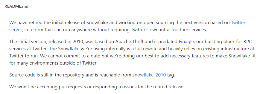 目前雪花算法在github上已经不维护了。Twitter把它放在了snowflake-2010标签下,还是可以下载到源码的。