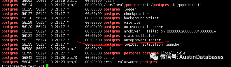 alter system set shared_preload_libraries = 'pg_prewarm';从启动服务器后,可以看到 autoprewarm master 的这个线程