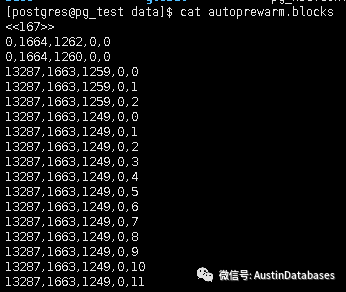 如果我们关闭数据库,在关闭期间将autoprewarm.blocks删除后,在重新启动PG 我们看看结果如何