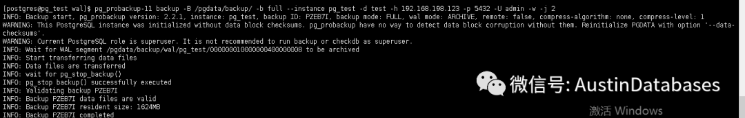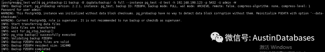 pg_probackup-11 backup -B pgdata/backup/ -b full --instance pg_test -d test -h 192.168.198.123 -p 5432 -U admin -w