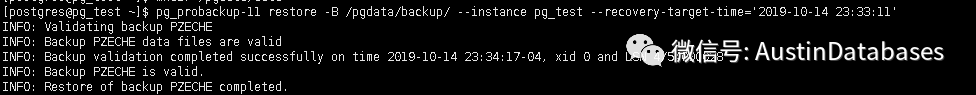 pg_probackup-11 restore -B /pgdata/backup/ --instance pg_test --recovery-target-time='2019-10-14 23:33:1