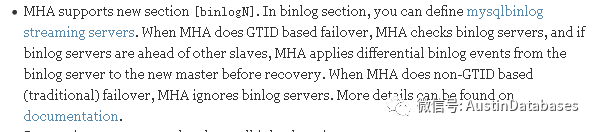 并且其中还提到了支持自定义的mysql binlog location, 在使用GTID 的MYSQL复制中,并且使用了auto_postion=1 的情况下MHA 将不能使用老的模式来获得差异的日志,而这里使用BINLOG SERVER 可以有效的提高增强MYSQL 主从切换中,可以让新主从 BINLOG SERVER 中获得差异的日志,并且补齐。
