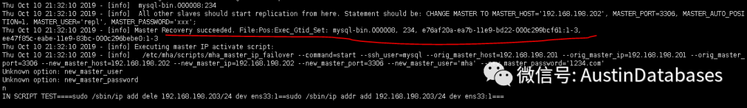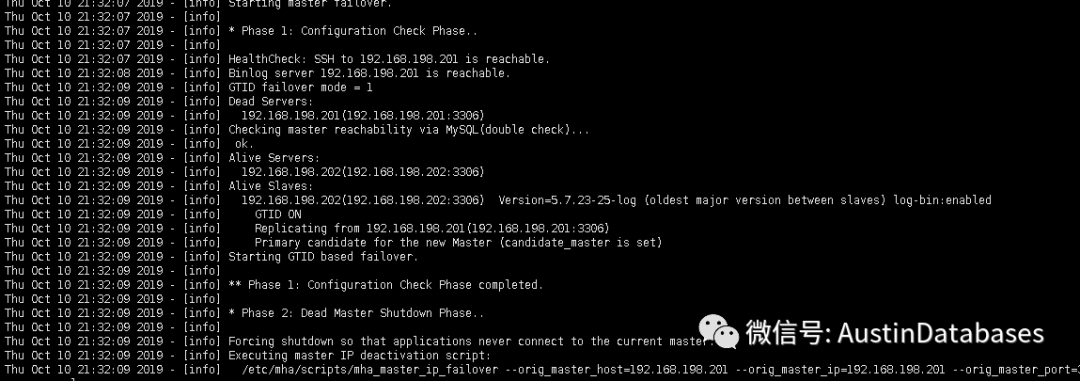 在启动了 GTID 的复制方式后,并且添加了BINLOG SERVER 选项后,尝试终止MASTER ,可以看到 MHA 已经自动判断出 MYSQL 使用 GTID的方式进行的复制。