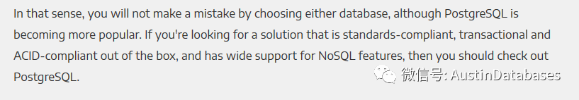 当然文章最后还是比较公平的,但在最后最后,还是不忘说了一句,PG 正在变得越来越流行并且部分功能比MYSQL 还是要技高一筹的。