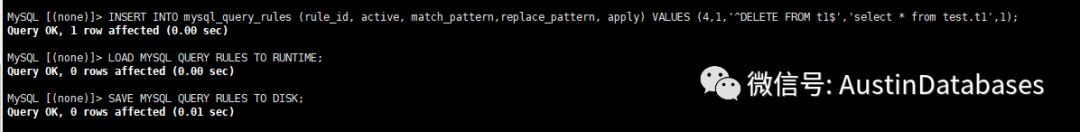 INSERT INTO mysql_query_rules (rule_id, active, match_pattern,replace_pattern, apply) VALUES (4,1,'^DELETE FROM t1$','select * from test.t1',1);