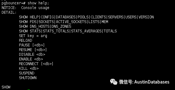 在登录后,我们可以查看pgbouncer 本身的数据库,里面有一些命令是pgbouncer 独有的。
