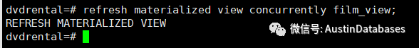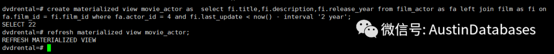 同时我们可以手动来刷新视图,通过命令 refresh materialized view movie_actor;
