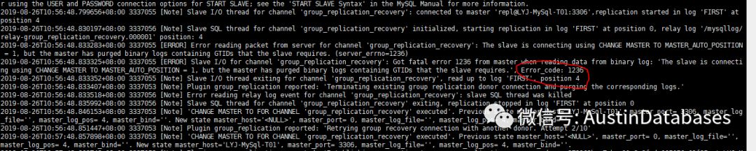 [ERROR] Error reading packet from server for channel 'group_replication_recovery': The slave is connecting using CHANGE MASTER TO MASTER_AUTO_POSITION = 1, but the master has purged binary logs containing GTIDs that the slave requires. (server_errno=1236)